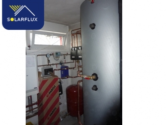 Solární rozvody z měděného potrubí (Cu) včetně tepelné izolace jsou vedeny souběžně se svodem dešťové vody v prostorách chodby a svedeny do technické místnosti v přízemí objektu. Zde je solární systém napojen na solární bojler značky Austria Email VT-S 1000 FRM.